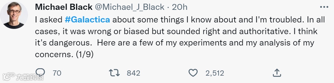 「它提供了听起来是权威的科学,但没有科学方法的基础。Galactica 根据科学写作的统计特性产生伪科学,很难区分真假。这可能会开启一个深度科学造假的时代。这些被生成的论文将被其他人在真实的论文中引用。这将会是一团乱麻。我赞赏这个项目的初衷,但提醒大家还是要注意,这不是科学的加速器,甚至也不是科学写作的有用工具。这对科学来说是潜在的扭曲和危险。」