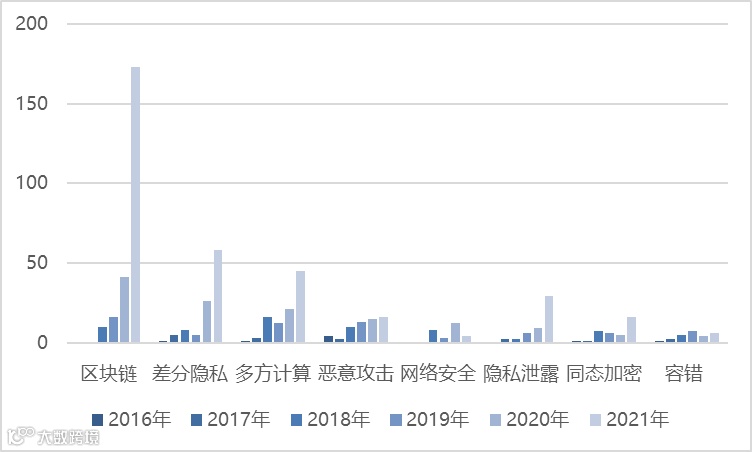 在安全隐私方面,区块链、差分隐私、多方计算、恶意攻击、隐私泄露和同态加密的研究热度总体持续逐年上涨。