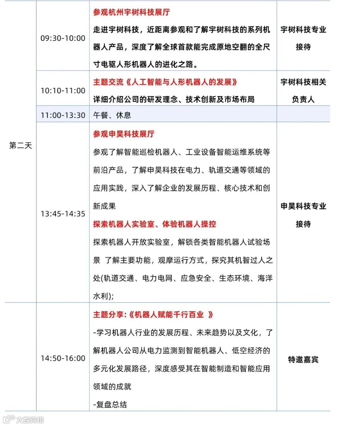 全天都在企业内部进行参观+交流,参观企业展厅,由企业专业人员讲解关于宇树科技、科大讯飞、申昊科技、和浙大机器人基地的特色企业文化,走进这些创新科技企业,紧密贴合行业热点,学习创新逻辑,体验创新科技带来的安全、智慧、便捷