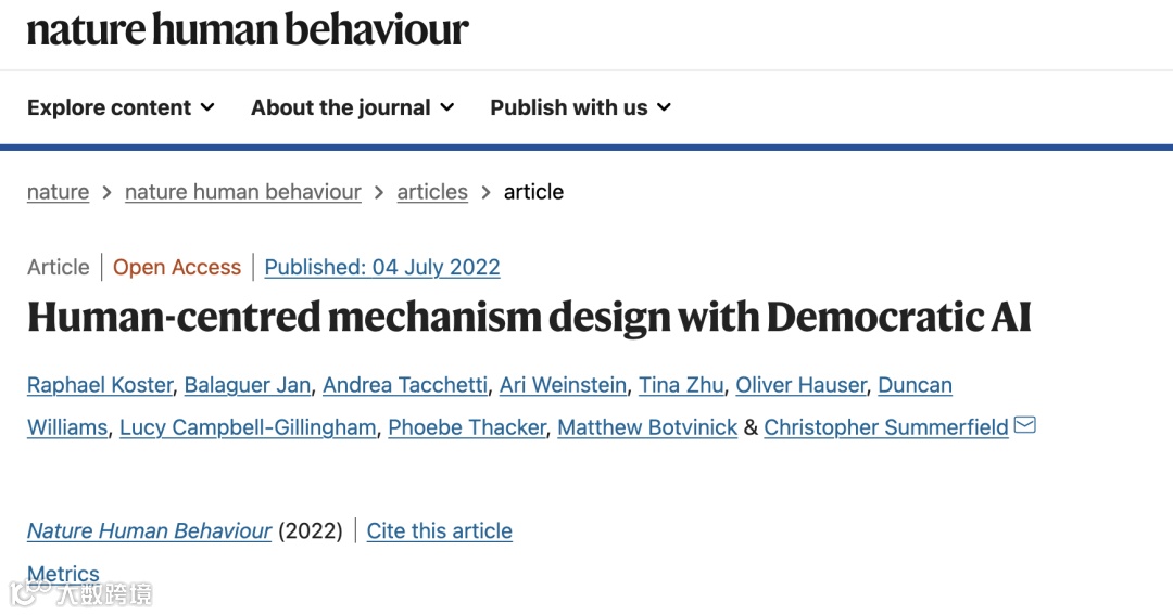 相关研究论文以“Human-centred mechanism design with Democratic AI”为题,于 7 月 5 日在线发表在权威科学期刊 Nature Human Behaviour 上。