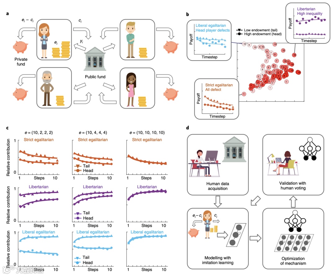 研究团队训练了一个深度强化学习代理,来设计一个重新分配机制,即在财富平等和不平等的情况下将资金分享给玩家。