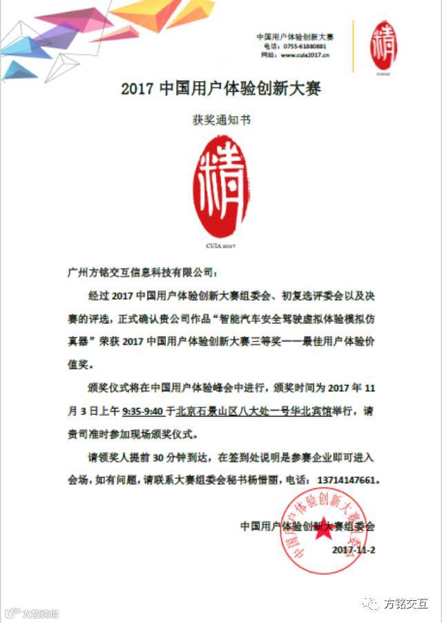 2017年11月3日,第五届中国用户体验峰会在北京隆重召开。峰会上举办了2017年度中国用户体验创新示范企业颁奖仪式,广州方铭交互信息科技有限公司被评为2017年度中国用户体验创新示范企业。