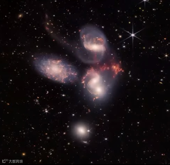 4、斯蒂芬五重星系 (Stephan's Quintet)是一个星系群,看上去是由五个星系构成,但其中只有四个星系靠得比较近,存在显著的引力相互作用,构成真正的星系群,观测表明,它们正在发生合并。这个五重星系最早是由法国天文学家Édouard Stephan发现的,因此命名为斯蒂芬五重星系。