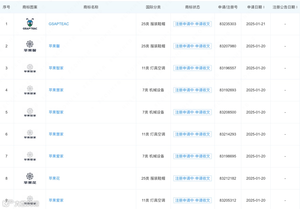 2月12日,苹果(中国)有限公司新增多个商标注册申请,其中包括 “苹果爱家”(国际分类:灯具空调、机械设备)、“苹果智家”(国际分类:灯具空调、机械设备)、“苹果慧家”(国际分类:灯具空调、机械设备)、“苹果馨”(国际分类:服装鞋帽)、“苹果花”(国际分类:服装鞋帽)、“GSAPTEAC”(国际分类:服装鞋帽)、“AEMAPE”(国际分类:灯具空调)等,当前状态均为注册申请中。