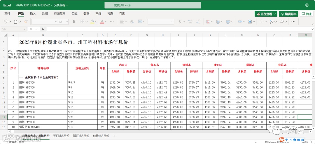转载于湖北省住房和城乡建设厅2023年8月湖北省各市、州工程材料市场信息价,点击“阅读原文”查看详情