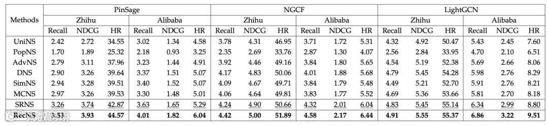 我们选择 PinSage、NGCF 和 LightGCN 作为基本的 GNN 编码器,在 Zhihu 和 Alibaba 数据集上进行了验证实验。实验表明,与 UniNS、PopNS、AdvNS、DNS、SimNS 和 MCNS 负采样方法相比,RecNS 能带来显著的推荐性能提升。此外,我们还将 RecNS 与 SRNS 进行了比较,SRNS 利用 memory 来保存候选的负样本并利用方差来解决假负样本问题(false negative problem)。RecNS 相较于 SRNS,在推荐性能上获得了一定的提升,原因在于 RecNS 利用曝光信息进行采样以缓解假负样本问题,并应用三区域原则来提供更多信息的候选负样本。在Alibaba数据集上,就 Recall@20 而言,RecNS 在 Pinsage 上的平均增益为 10.47%,在 NGCF 上为 6.02%,在 LightGCN 上为 8.20%。