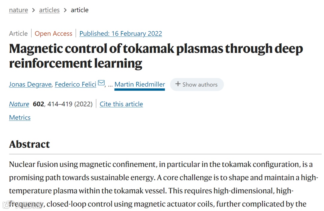 继此前振奋业界的蛋白质预测成果之后,今日,DeepMind 又一个硬核研究亮相,在这篇名为 Magnetic control of tokamak plasmas through deep reinforcement learning的nature 文章,DeepMind 的科学家和来自 Swiss Plasma Center - EPFL 的研究者,共同提出了一种强化学习算法,来控制托卡马克核聚变反应堆内的等离子体。