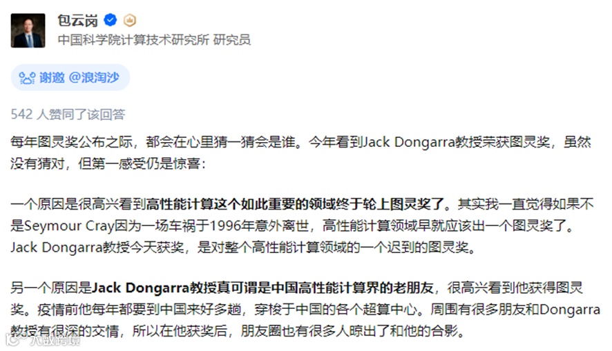 正如颁奖词中所说,他开创性的概念和方法推进了给世界带来改变的计算。他在数值算法和库方面的开创性贡献,使得高性能计算软件能够跟上四十多年来的指数级硬件更新。
