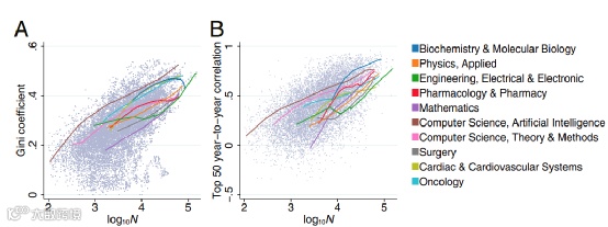 被引用最多的论文在更大的领域中获得了不成比例的引用。最大的领域的基尼系数约为 0.5(图 1A),这与最不平等的国家的收入不平等一样大,只有中国和南非的基尼系数高于 0.5。排名靠前的论文被引用的数量不成比例,导致了不平等关注的增加。