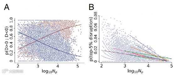 在同一年发表的大多数论文都是建立在现有文献的基础上,而不是颠覆现有文献(图 4A)。逻辑回归拟合预测,当在某一领域内发表 1000 篇论文时,49% 的论文有中断措施。当发表1万篇论文时,预计创立性论文的比例将下降到 27%,而在 10 万 篇论文时,将下降到 13%。一篇新发表的论文的创立性影响在更大的领域是微弱的。图4B显示了按领域划分的新论文占创新指标前 5% 的比例。Lowess 估计显示,在该领域年度发表 1000 篇论文时,具有前 5% 干扰指标的新论文所占比例从 8.8% 下降到 3.6%(每年发表 1 万篇论文)和 0.6%(每年发表 10 万篇论文)。