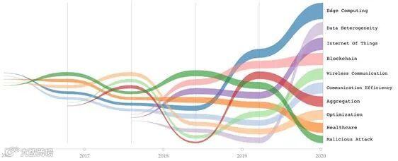 报告对联邦学习发展趋势进行了分析。在研究趋势方面,通过对 AMiner 数据库中联邦学习相关论文的分析,生成技术发展趋势河流图。基于边缘计算、数据异质性的联邦学习研究以及在物联网应用方面的研究热度在 2019 年左右上升明显,并且之后一直居于领先位置。