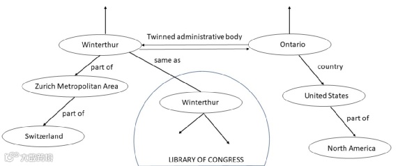 如果可以把 Wikidata 的知识图谱完全整合到维基百科中,就可以消除例子中提到的缺失链接的情况。我们可以在图 3 中直观地看出温特图尔和安大略市间的双向关系。另外,图 3 的知识图谱中还显示了与温特图尔和安大略市相连的其他对象及关系。