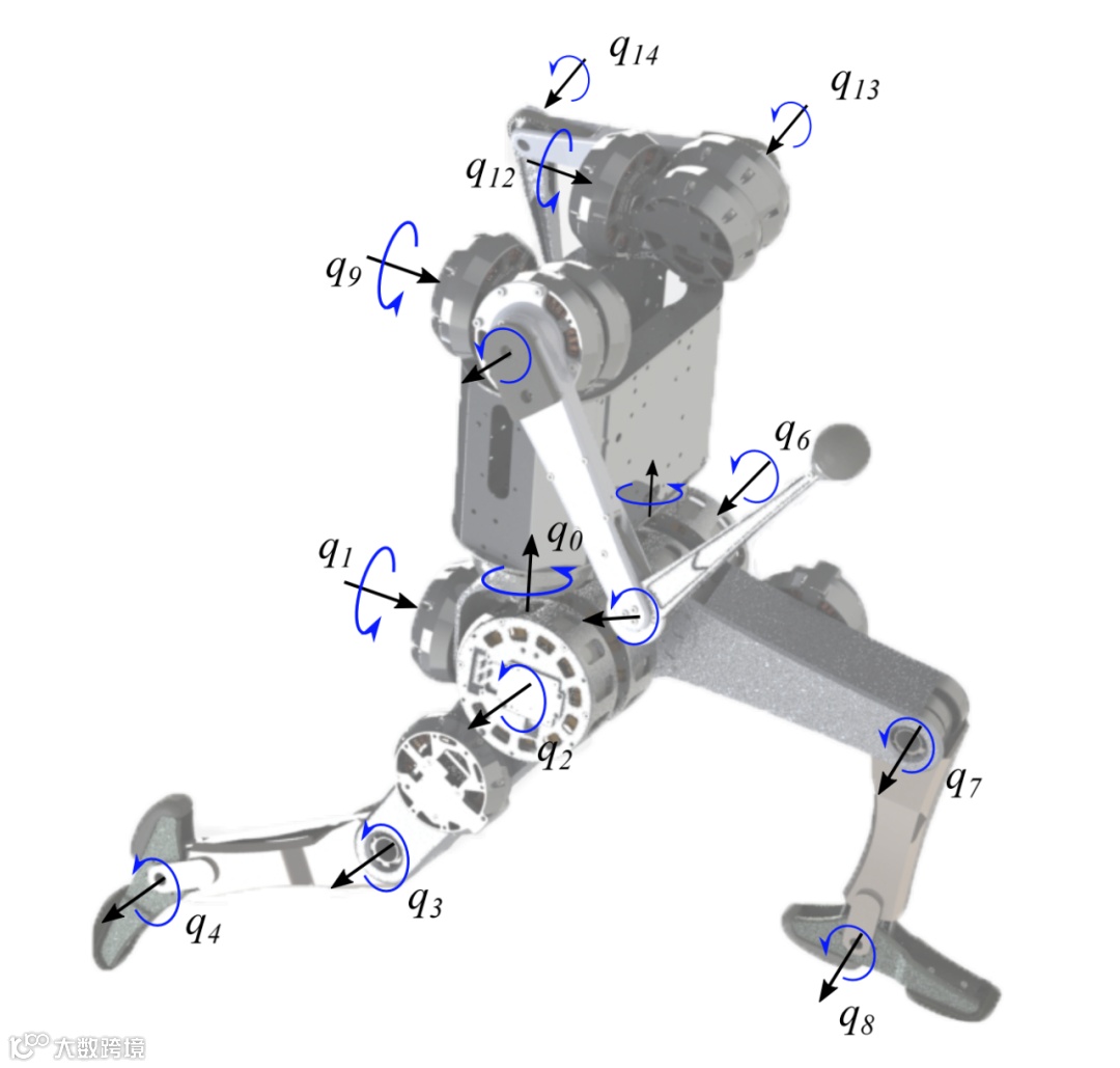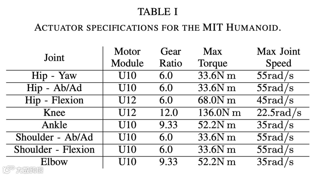 研究人员表示,该机器人的腿部有五个定制的执行器:三个位于臀部,一个位于膝盖,还有一个用于控制脚踝的转动。膝盖、脚踝和关节均有一个皮带传动系统,以在这些关节提供更高的扭矩。五个执行器使得每条腿在每只脚上产生三维地面反作用力,以及每只脚的转动和偏航轴的力矩。