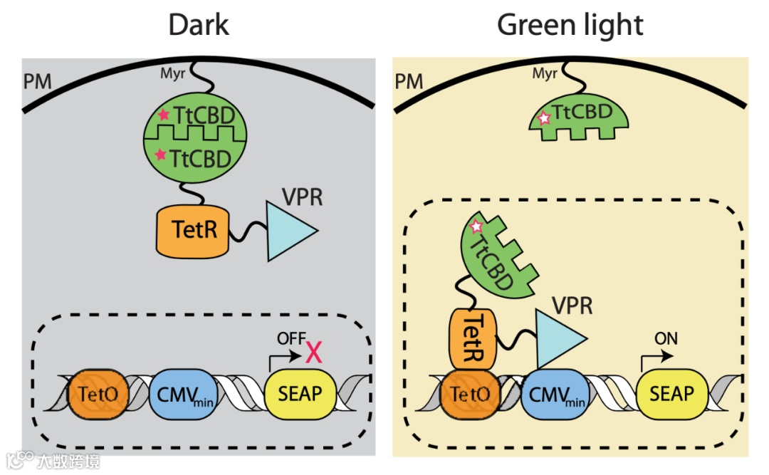 图|Glow Control 示意图(来源:Nature Communications) 具体来说,Glow Control 主要由两部分组成。一部分是对绿光敏感的连接在细胞膜上的嗜热菌(Thermus thermophilus,TtCBD)光感受器,另一部分是人工合成的转录因子。在绿光照射下,转录因子便会脱离原位进入靶向细胞核,从而激发胰岛素基因的改变。当绿光熄灭时,转录因子便会重新和细胞膜上的光感受器连接。