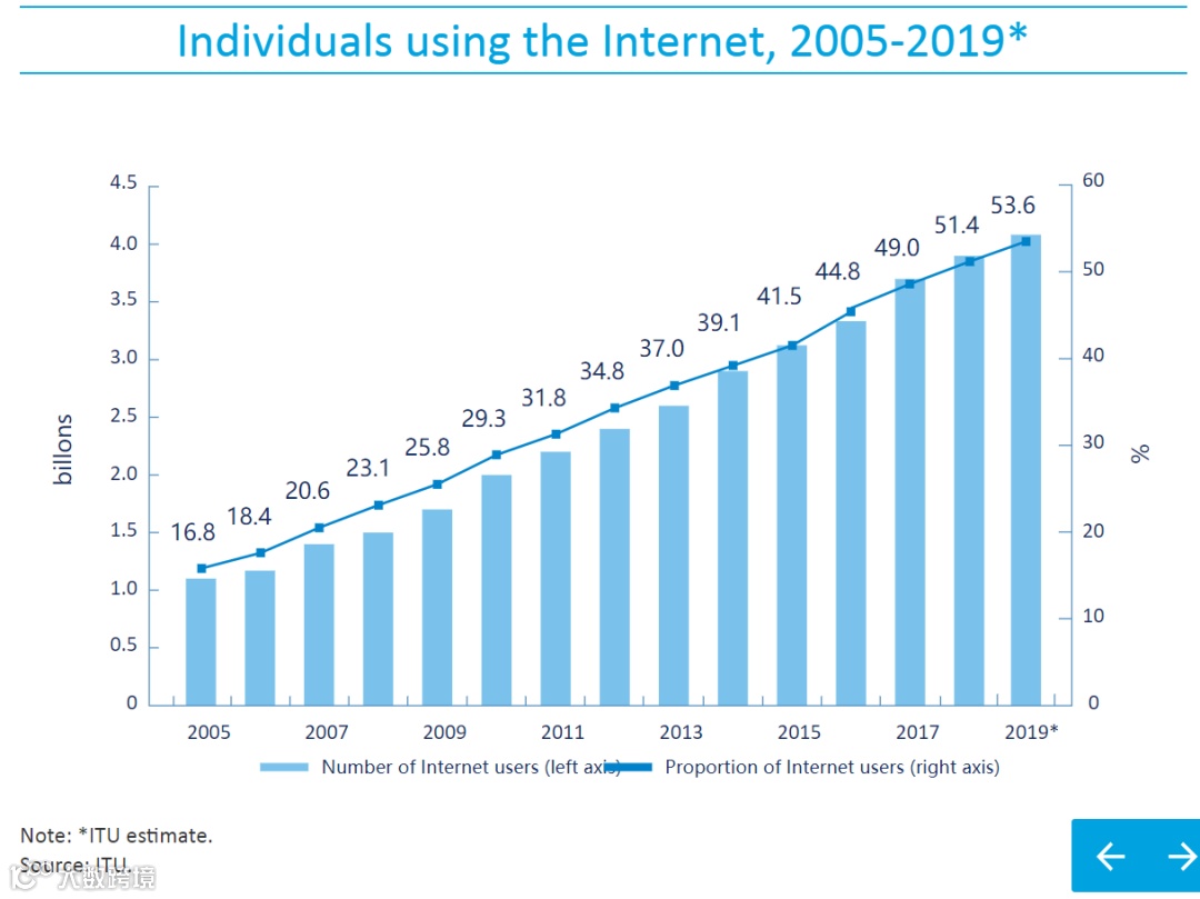 全球个人用户网络使用占比(2005--2019)