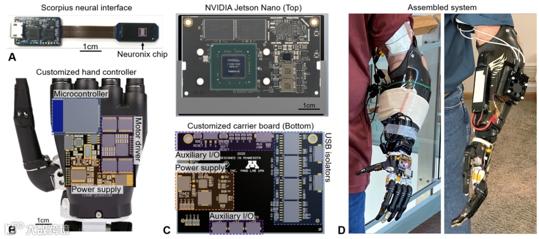神经数据通过 Scorpius 神经接口(图 A)获得,Scorpius 系统的小型化外形使其可以部署在各种可穿戴和可植入的应用中。设备由承载板通过隔离的 USB 链路供电,所获得的数据直接传输到 Jetson Nano 进行进一步处理。
