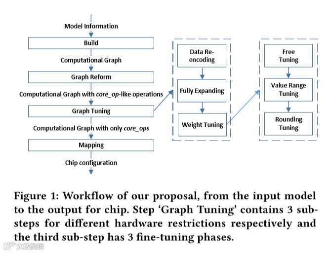 图1 转化流程图,分为图重构和图微调两个步骤,图微调包含了三个子步骤来解决不同类型的硬件约束,其中权重微调又包含了三个阶段来适应不同类型的权重约束。