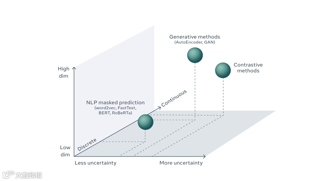 对比方法的基本思想是构造不相容的 x - y 对,并调整模型的参数使得相应的输出能量较大。用对比方法训练能量模型,包括同时从训练集中压缩兼容(x,y)对的能量(用蓝点表示) ,同时压缩以绿点表示的精心选择的(x,y)对的能量(用绿点表示)。在这个简单的例子中,x 和 y 都是标量,但在实际情况中,x 和 y 可能是一个具有数百万维度的图像或视频。找出不相容的x-y对,从而以适当的方式塑造能量,从计算上讲是具有挑战且昂贵的。通过遮盖或替换某些输入词来训练 NLP 系统的方法属于对比法的范畴。但是它们没有采用联合嵌入结构。相反,它们使用一种预测结构,在这种结构中,模型直接为 y 生成预测。一开始是一段完整的文本 y,然后破坏它,例如通过遮盖一些词来生成观察 x。破坏的输入会被输入到一个大型神经网络中进行训练,来重现原始文本 y。将一个没有破坏的文本,重建为自身,这时为低重建错误;而将一个破坏的文本重建,这时或得到一个较大的重建错误。如果将重建错误解释为能量,它将具有所期望的特性: 正常的文本,能量较低;被破坏的文本,能量较高。 训练一个模型,对一个被损坏的输入进行恢复,这项技术被称为去噪自动编码器。虽然这个想法最早可以追溯到20世纪80年代,但2008年蒙特利尔大学Pascal Vincent等人重新提出这个模型,随后由Collobert 和 Weston把它引入到 NLP 当中,后通过谷歌发表的 BERT 论文流行起来。掩码语言模型是去噪自动编码器的一个实例,本身就是对比自监督学习的一个实例。变量 y 是一个文本片段;x 是文本中某些词被屏蔽的版本。网络经过训练可以重构未被破坏的文本。正如我们前面所指出的,这种类型的预测架构只能对给定的输入产生单个预测。因为模型必须能够预测多种可能的结果,所以预测不是一组词,而是一系列词汇表中每个缺失词位置的得分。但是我们不能对图像使用这个技巧,因为我们不能枚举所有可能的图像。这个问题有解决办法吗?简单来说,答案是否定的。在这个方向上有很多有趣的想法,但是它们还没有产生和联合嵌入结构一样好的结果。一个有趣的途径是隐变量预测架构。 一种隐变量预测结构。给定一个观测值 x,该模型必须能够产生一组由图中 s 形带状符号的多重兼容预测。由于隐变量 z 在一个集合中变化,由一个灰色正方形表示,输出随着一组似是而非的预测而变化。隐变量预测模型包含一个额外的输入变量(z)。它被称为latent,因为它的值从来没有被观察到。在一个训练好的模型中,当隐变量在给定集合中变化时,输出预测会随着与输入 x 相容的合理预测集合的变化而变化。隐变量模型可以用对比方法进行训练。一个很好的例子就是生成对抗性网络(GAN)。鉴别器可以看作在计算一个能量,表明输入 y 是否看起来不错。生成器会产生对比样本,训练鉴别器会与高能量联系在一起。但是对比方法有一个主要的问题: 它们训练起来效率很低。在图像这样的高维空间中,有许多方式可以使一个图像与另一个图像不同。找到一组能够涵盖它们与给定图像的所有不同方面的对比图像几乎是不可能的任务。套用列夫 · 托尔斯泰的《安娜 · 卡列尼娜》中的一句话:“幸福的家庭都是相似的,不幸的家庭各有各的不同。”这似乎适用于任何一类高维物体。如果有可能确保不相容对的能量高于相容对的能量,而不明确去提高不相容对的能量,那会怎样呢? 基于能量的非对比自监督学习 应用于联合嵌入架构的非对比方法(Non-contrastive methods)可能是当前视觉自监督学习研究的热点。这一领域在很大程度上还是一篇荒芜,不过也包含了极大的希望。非对比的联合嵌入方法包括DeeperCluster, ClusterFit, MoCo-v2, SwAV, SimSiam, Barlow Twins, DeepMind的BYOL等。它们使用各种技巧,如对相似图像的组进行计算虚拟目标嵌入(DeeperCluster, SwAV, SimSiam),或通过架构或参数向量使两个联合嵌入架构略有不同(BYOL, MoCo)。Barlow Twins 尝试最小化嵌入向量各个分量之间的冗余。也许从长远来看,一个更好的选择是,设计一种带有隐变量预测模型的非对比方法。这里主要的困难是,它们需要一种方法来最小化隐变量的容量。隐变量可以在其上变化的集合的体积,限制了使用低能量的输出的体积。通过最小化这个体积,我们就能自动地塑造能量。这种方法的一个成功例子是变分自编码器(VAE),它将隐变量“模糊化”,从而限制了其能力。但是,目前还没有研究表明VAE能够对下游的视觉任务产生良好的表征。另一个成功的例子是稀疏建模,但它的使用仅限于简单的架构。似乎还没有比较完美的方法来限制隐变量的能力。未来几年的挑战可能是,为基于能量的隐变量模型设计非对比方法,从而成功地生成图像、视频、语音和其他信号的好的表征,并在不需要大量标记数据的情况下在下游监督任务中获得最佳性能。