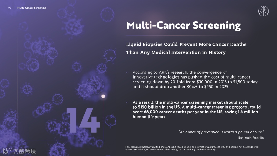 关于医疗保健,ARK 相信,与历史上任何其他医学干预措施相比,使用液体活检进行多种癌症筛查可以预防更多癌症死亡。