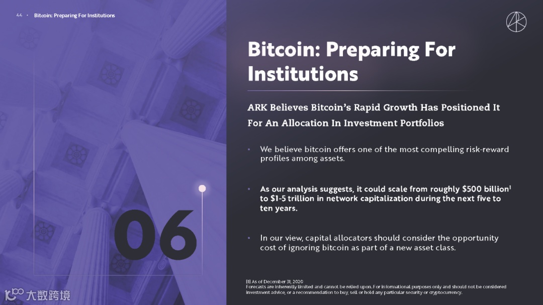 ARK 认为,比特币的快速增长已使其定位在投资组合中。“我们认为比特币提供了资产中最引人注目的风险回报收益比。正如我们的分析的那样,在未来五到十年内,它的网络资本规模可能从大约 5000 亿美元扩大到 1-5 万亿美元。”
