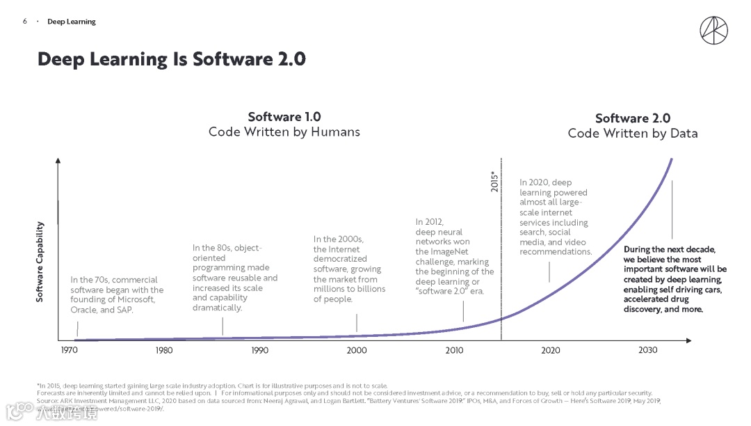 ARK 团队认为深度学习可能是我们这个时代最重要的软件突破。报告指出,深度学习将在未来 15-20 年内,为全球股票的市值增加 30 万亿美元。