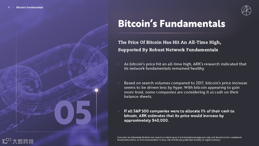 更颠覆传统的是 ARK 团队对比特币的预测和观察。ARK 团队估计,如果所有的标普 500 指数公司将 1% 的现金用于比特币,比特币的价格将上涨约 4 万美元。