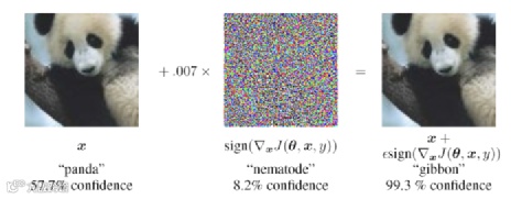 对抗性攻击的目标是机器学习对i.i.d.的敏感性。在上图中,给熊猫图像上添加一层难以察觉的噪音,卷积神经网络就会错判为长臂猿。