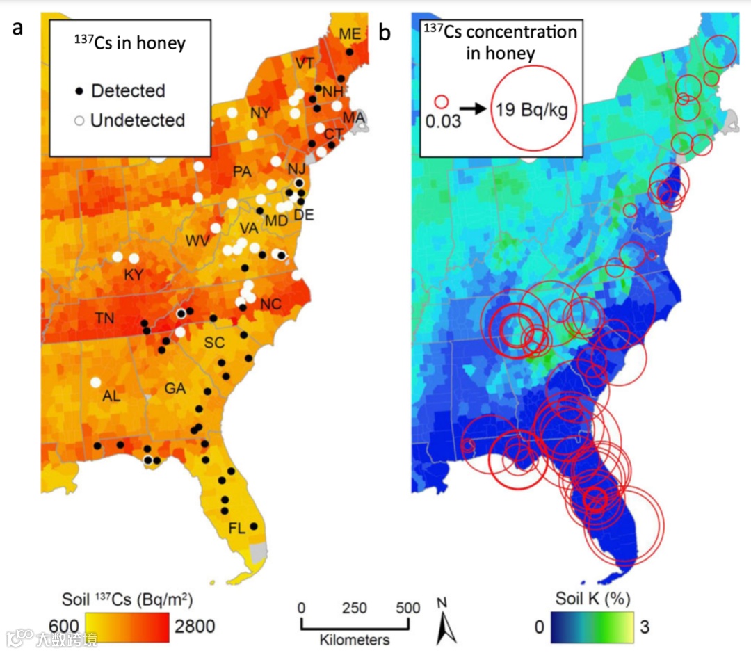 如果蜂蜜的137Cs内容遵循了类似的趋势,那么美国东南部(佐治亚州、佛罗里达州、南卡罗来纳州、北卡罗来纳州)蜂蜜中的平均放射性铯含量在20世纪60-70年代可能远远超过100Bq kg - 1,甚至超过了大多数国家的浓度标准。数据还表明,在美国东南部缺乏钾的土壤中生长的植物在大气沉降几十年后更容易吸收放射性铯,而且这种污染通过动物采集者转移到食物中。