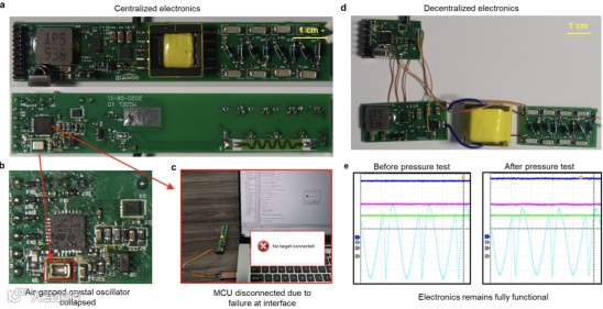 实验室试验和模拟表明,这种布置降低了受压部件之间接口处的应力,然后将分布式电子器件嵌入硅树脂中,以便并入机器人,该方法比其他保护深海设备电子设备的方法更实用,也更便宜。