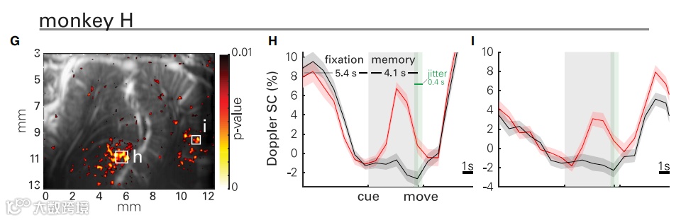 同时,为了在 PPC 中寻找与目标相关的血流动力学信号,研究人员在猴子们的硬脑膜上放置了一个小型的 15MHz 线性传感器来获取 fUS 图像。该传感器可提供 100um*100um 的空间分辨率,厚度为 400um,可覆盖面积宽为 12.8mm,侵彻深度为 16mm。研究人员将探头表面放置在了 PPC 上的冠状位(下图 A 和 B),然后他们选择了可显示行为调节血流动力学活动的包含顶叶内侧沟(IPS)外侧和内侧的超声波图像。