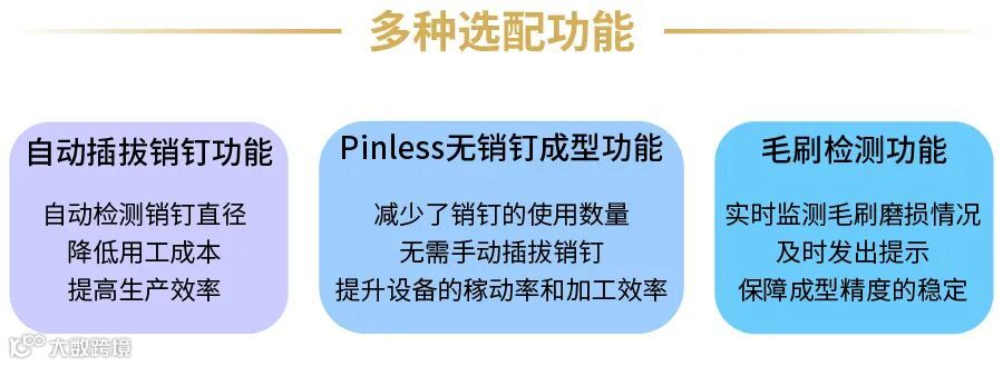 维嘉成型机采用X、Y、Z三轴直线电机驱动,无摩擦、免维护、无更换丝杆的预期成本,降低机器维修费用。可选配自动插拔销钉、Pinless无销钉成型和毛刷检测功能,有效降低人工成本。