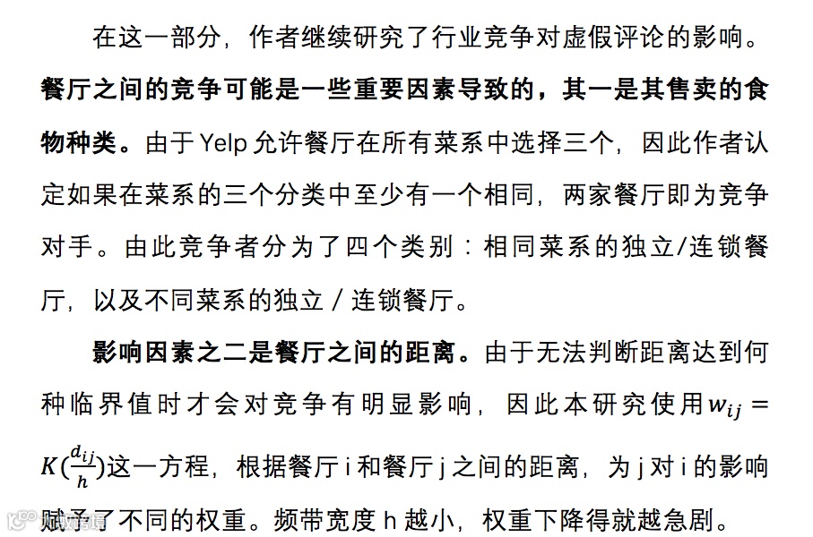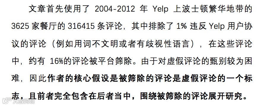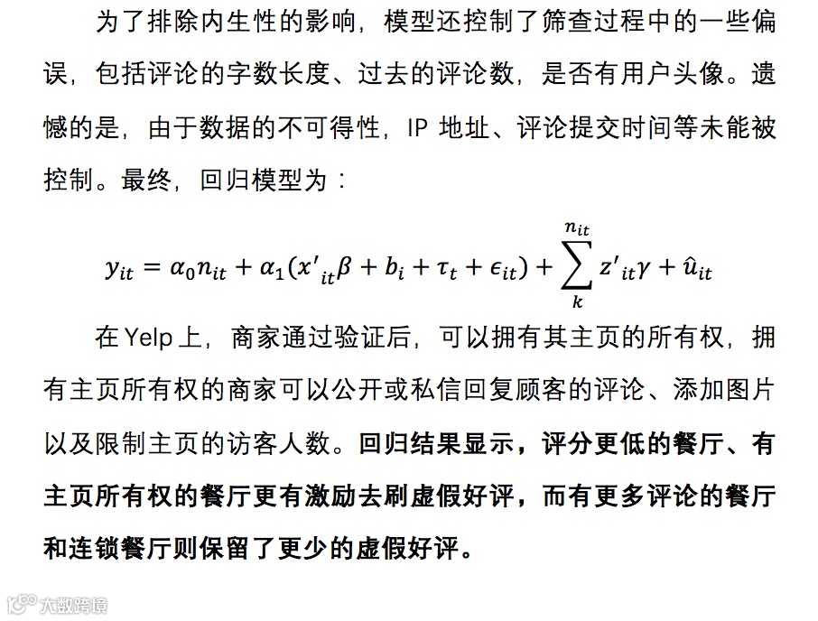 在众包平台中,如何在商业竞争中维护信息的质量,向来是一个重要的话题。点评网站们也意识到了这一问题的存在,并且采取了相应的筛查机制,利用算法筛查出潜在的虚假评论,并在商家主页中屏蔽这些评论,以减少其带来的影响。本文作者利用全美最大的点评网站Yelp上的数据进行了研究,对平台使用的欺诈检测算法的效果进行了验证,并探究了这些虚假评价出现背后的经济学动机。