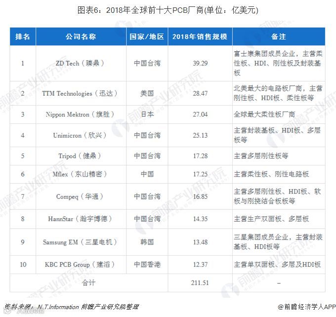 全球印刷电路板行业集中度不高,生产商众多,市场竞争充分。虽然目前PCB行业存在向优势企业集中的发展趋势,但在未来较长时期内仍将保持较为分散的行业竞争格局。根据N.T.Information发布的2018年世界百强PCB企业排行榜,2018年前十大PCB厂商收入合计为211.51亿美元。2018年全球前十大PCB厂商的销售情况如下: