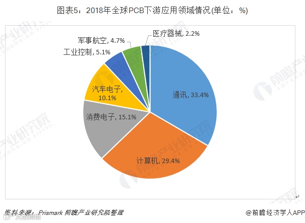 电子信息产业的蓬勃发展是PCB行业发展的重要助力。从下游应用领域分布来看,2018年通讯行业的PCB市场规模最大,占比约为33.4%;其次是计算机行业,占比约为29.4%。其他领域PCB市场规模较大的是消费电子、汽车电子。