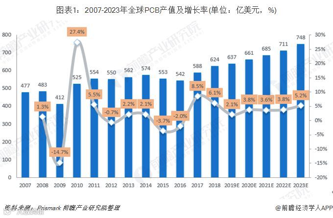 在当前全球经济复苏的大环境下,通讯电子行业、消费电子行业需求相对稳定,同时汽车电子、医疗器械等下游市场的新增需求逐年上升。根据Prismark预测,未来五年全球PCB行业产值将持续稳定增长,预计2018年至2023年复合增长率为3.7%,2023年全球PCB行业产值将达到747.56亿美元。