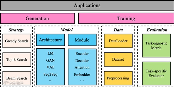 现有的开源文本生成库大致可分为两类,一类倾向于模块化驱动,提供各个组件供研究者搭建不同的模型,但缺点在于许多特殊的baseline无法通过模块完成;另一类倾向于baseline驱动,方便用户快速调用baseline,但缺点在于整体结构不够统一,可扩展性有限。