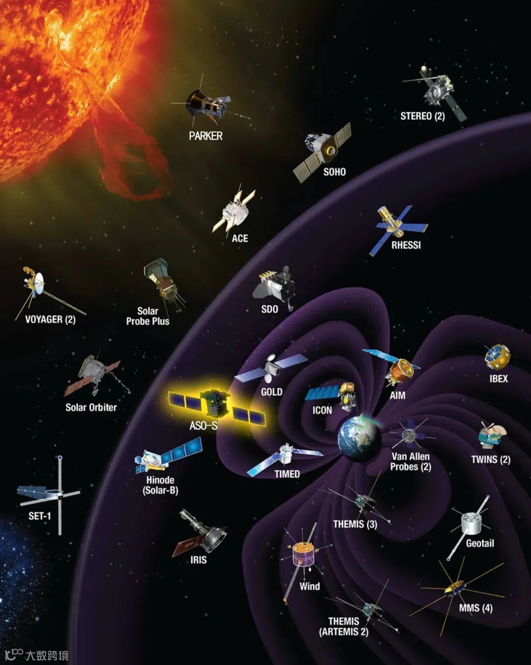 探索太阳的一系列任务,发光处为研制中的ASO-S卫星。图片来源:中科院紫金山天文台