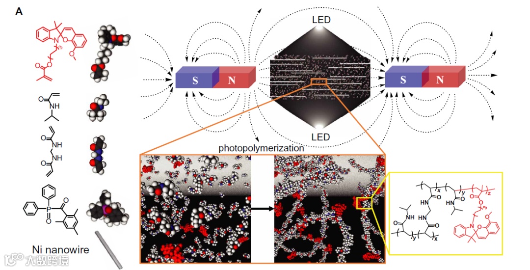 研究团队使用化学合成法来编程该材料的分子以响应光照。当暴露在光下时,机器人的材料分子会变得疏水(排斥水),导致内部水分丧失,从而使材料的液体稠度达到一定标准,这样才能响应磁场。这种转换使机器人能够继续工作,并从原本的平面形态弯曲到“站立”状态。