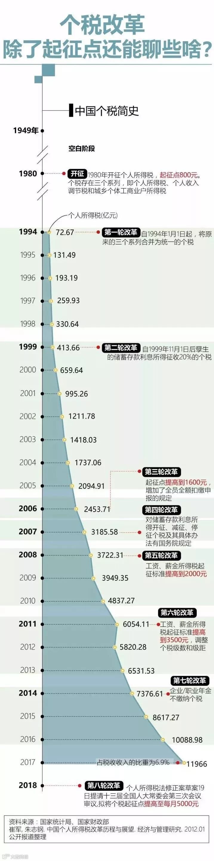 其实,个税起征点一直根据实际情况进行着不断调整。根据《中国税务年鉴》数据显示,个税收入结构中有60%左右来自工资、薪金所得。我们来看一下中国个税简史图: