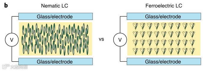 虽然传统的向列相LC透镜驱动方法响应时间较慢,约为几十到数百毫秒,不足以达到高速变焦的效果,但研究人员发现利用铁电液晶透镜便能实现高速变焦的光学元件,如图1所示,这是由于铁电液晶呈现出具有明确定义的层和手性特性,可以对电场产生自发极化响应,从而可以实现亚秒级别的光变焦时间。