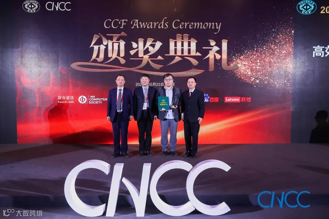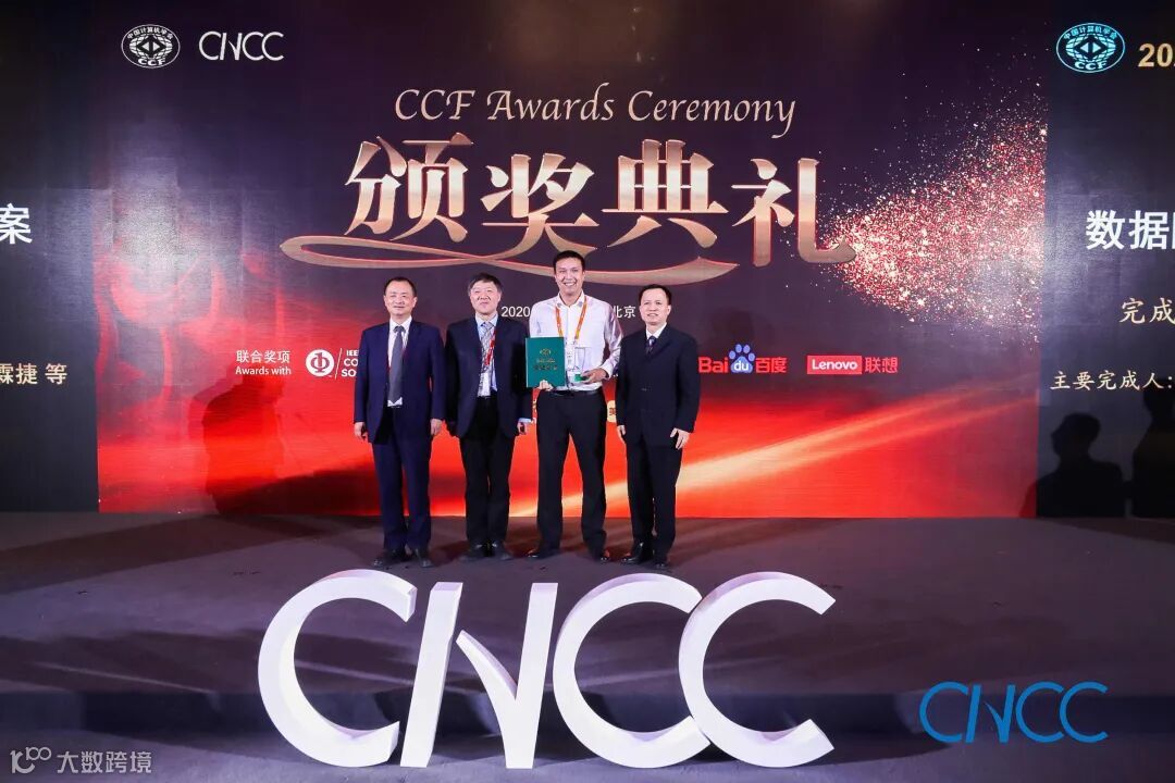 CCF 理事长梅宏教授(左一)、百度校园品牌部总监李轩涯博士(右一)为郭得科教授颁奖