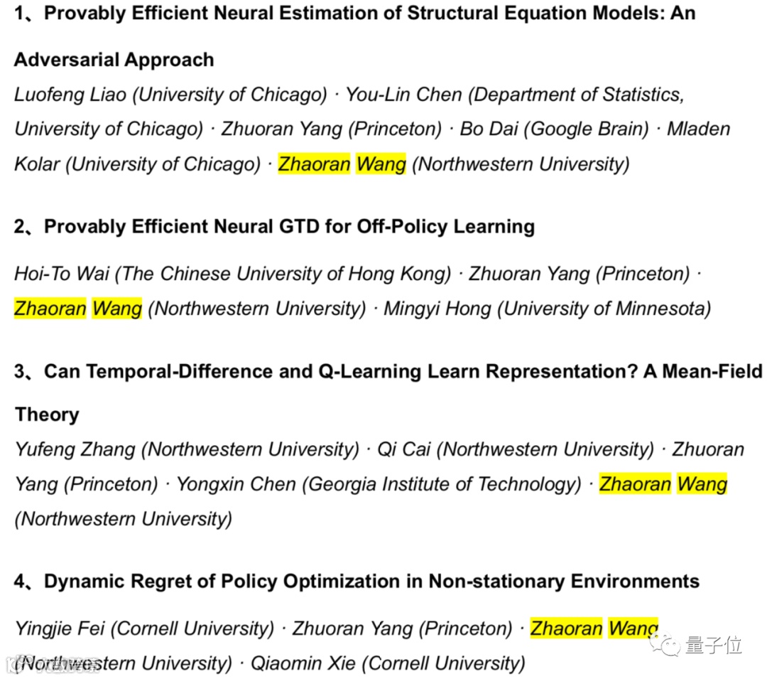 德克萨斯大学奥斯汀分校的汪张扬、普林斯顿大学的杨卓然则有8篇论文接收数。