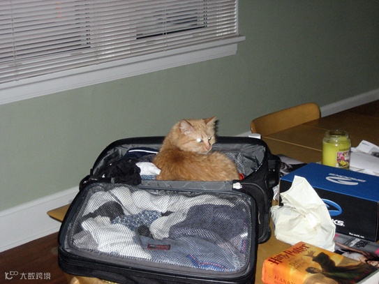 获得此类数据集的最常用方法是收集带有描述性标题的图像集合。例如,下面的图片的标题为 “一只橘猫坐在准备打包的手提箱里。” 这与典型的图像数据集不同,后者仅用一个名词来标记下面的图片,例如 “猫”。因此,一种视觉语言数据集不仅可以教一个 AI 模型如何识别目标,而且还能使用动词和介词来告诉模型目标之间是如何相互影响和相互作用的。