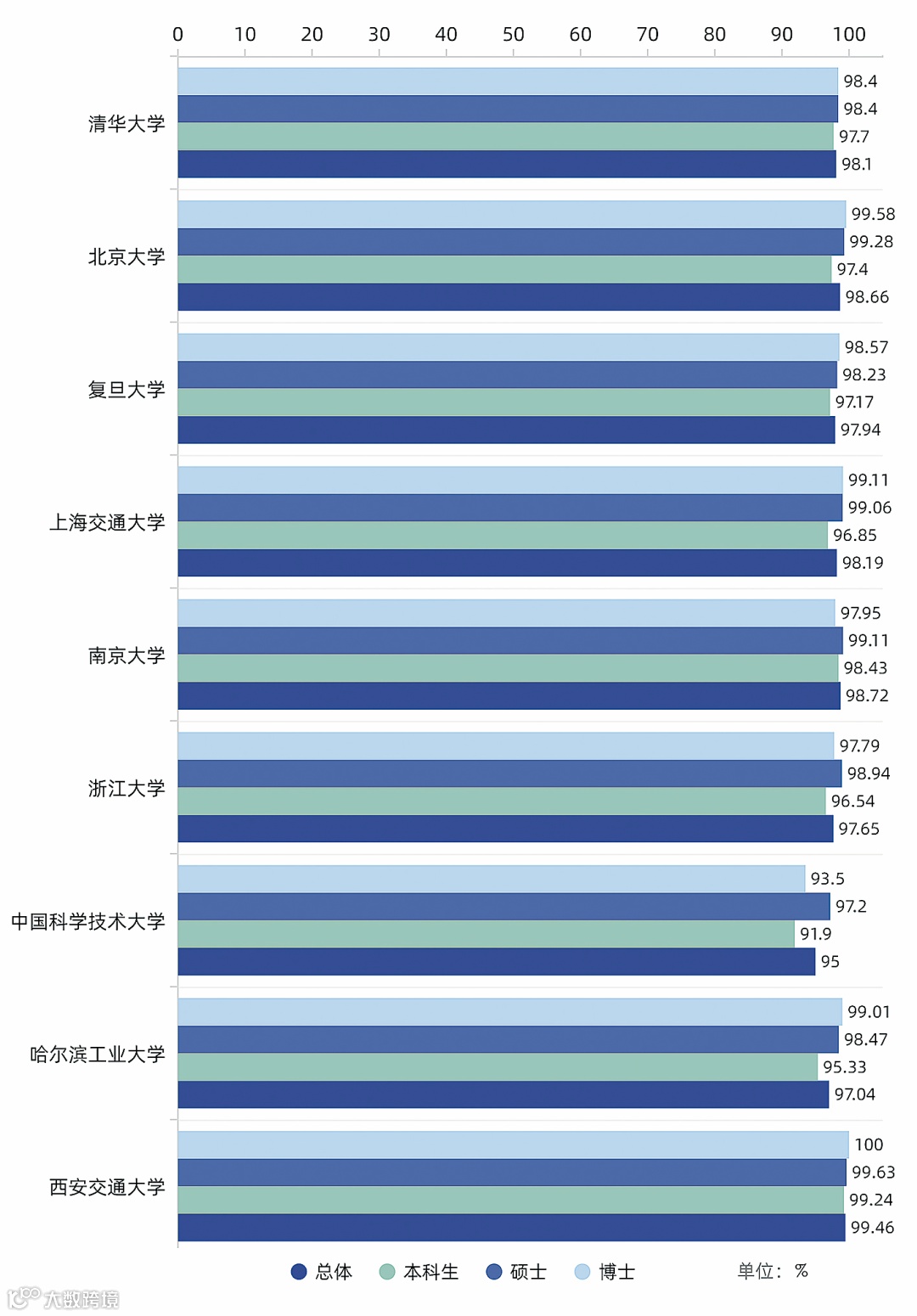 不过,南京大学成为个例,博士生就业率为97.95%,低于本科生和硕士生就业率。另外,除中国科大、浙大博士生就业率略低于硕士生就业率外,其他高校博士生就业率均为最高。