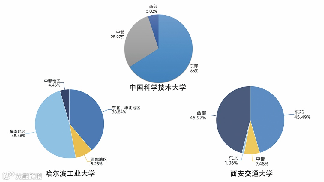 图3. 中国科大、哈工大、西安交大2019届毕业生就业地区分布