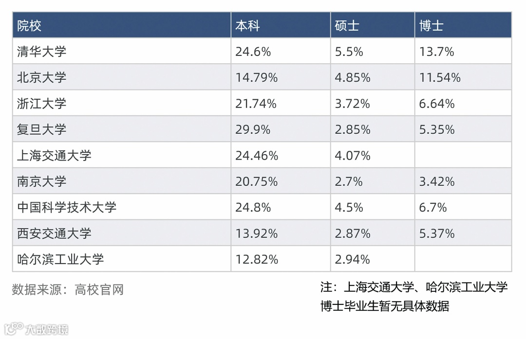 以清华大学为例,其2019届本科生出国(境)深造率为24.6%,相比2018届本科毕业生的26.3%下降了1.7个百分点。这在一定程度上说明,国内的高校实力、教学水平、学习平台都在不断进步,更多学生愿意留在国内进行学习深造。