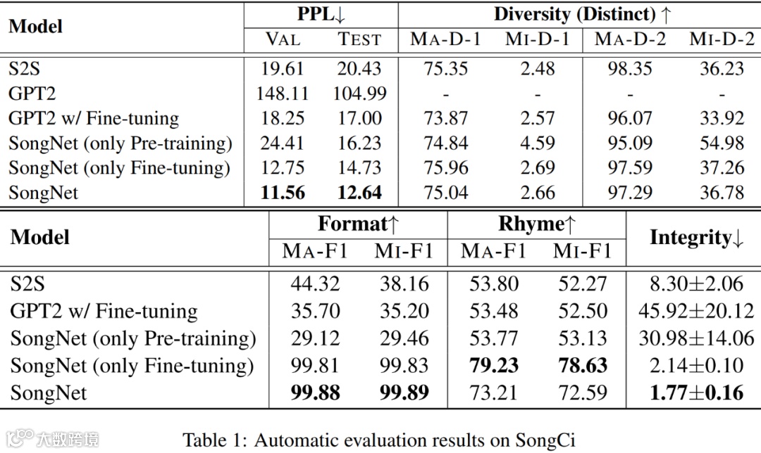 除了常用的文本生成评测指标 PPL、Distinct 外,本文还专门设计了衡量格式(Format)准确率、韵律(Rhyme)准确率和句子完整性(integrity)的指标。