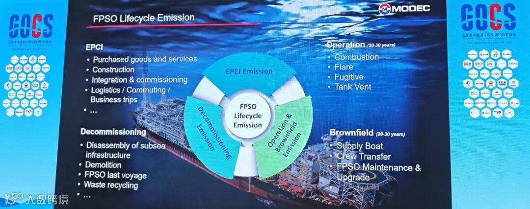 据悉,全球2024年原油产量达每日1.029亿桶,其中28%来自海上油田。FPSO作为海上油气生产的核心设施,其碳排放问题日益受到关注。XT Tan在演讲中详细分析了FPSO从设计、建造、安装、运营至退役的全生命周期排放来源,并强调尽管大部分排放不属于MODEC的直接排放范畴,公司仍致力于通过技术合作与创新推动整个价值链的减排。