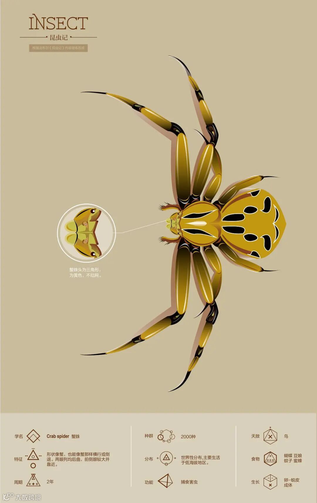 著名昆虫学家法布尔就在他的著作《昆虫记》中对蜘蛛展开了详细的描述(需要说明的是,蜘蛛并不是昆虫):正像我眼前所呈现的一样,无论从举止还是从颜色上讲,条纹蜘蛛是我所知道的蜘蛛中最完美的一种。在它那胖胖的像榛子仁一般大小的身体上,有着黄、黑、银三色相间的条纹,所以它的名字叫“条纹蜘蛛”。