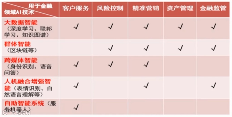 此外潘云鹤院士还制作了智能金融的鸟瞰图,从大数据智能、群体智能、跨媒体智能、人机融合增强智能和自动智能系统五大 AI 技术出发,绘制出了 AI 技术在金融领域应用的图谱,让 AI 技术能在客户服务、风险控制、精准营销、资产管理和金融监管等领域发挥更大的作用。